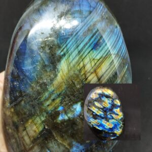 Elle fait partie de mes pierres préférées, aucune ne se ressemble elles sont toutes magnifiques avec des reflets différents. De la spectrolite bleu, violette, banche, verte, rose, jaune … Véritable pierre de protection pour tous les thérapeutes .